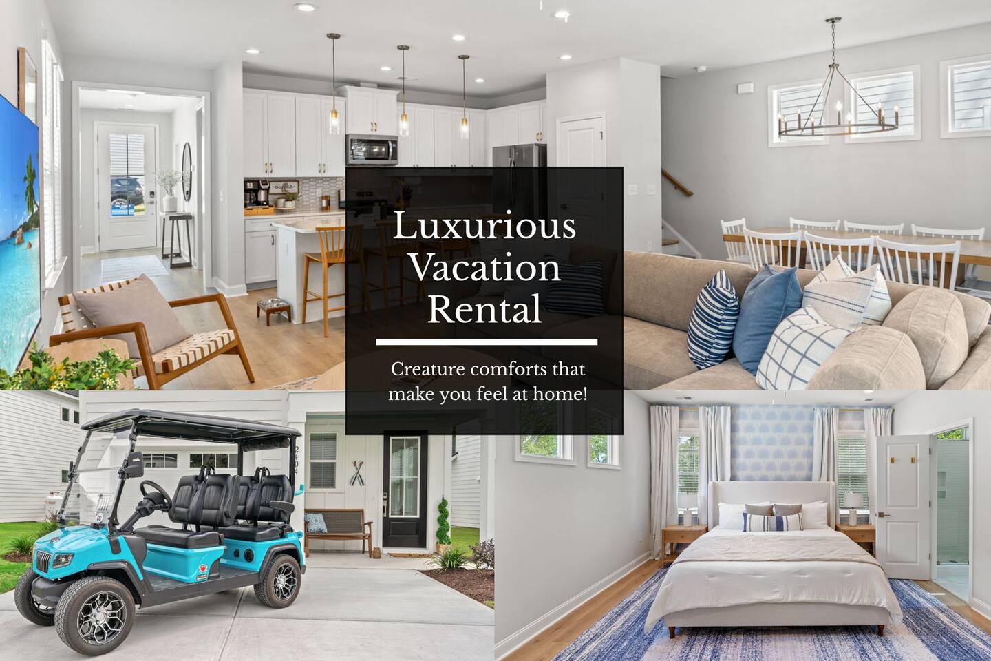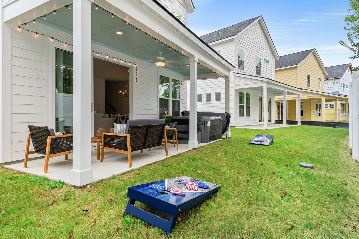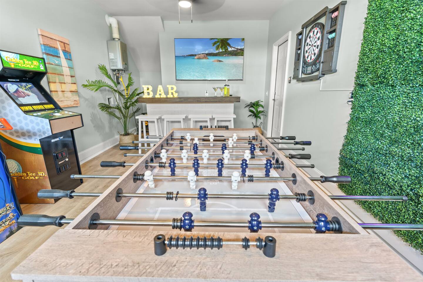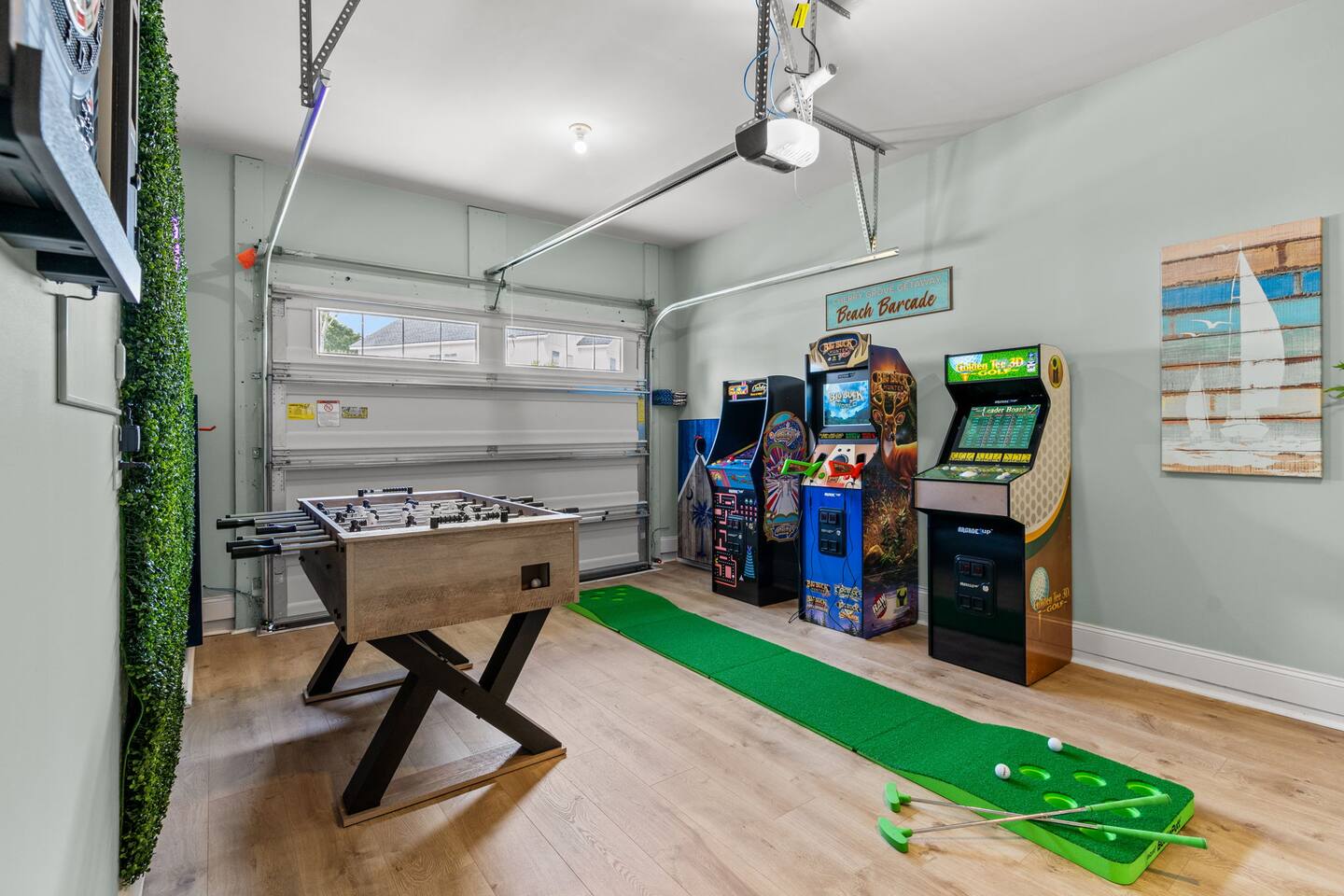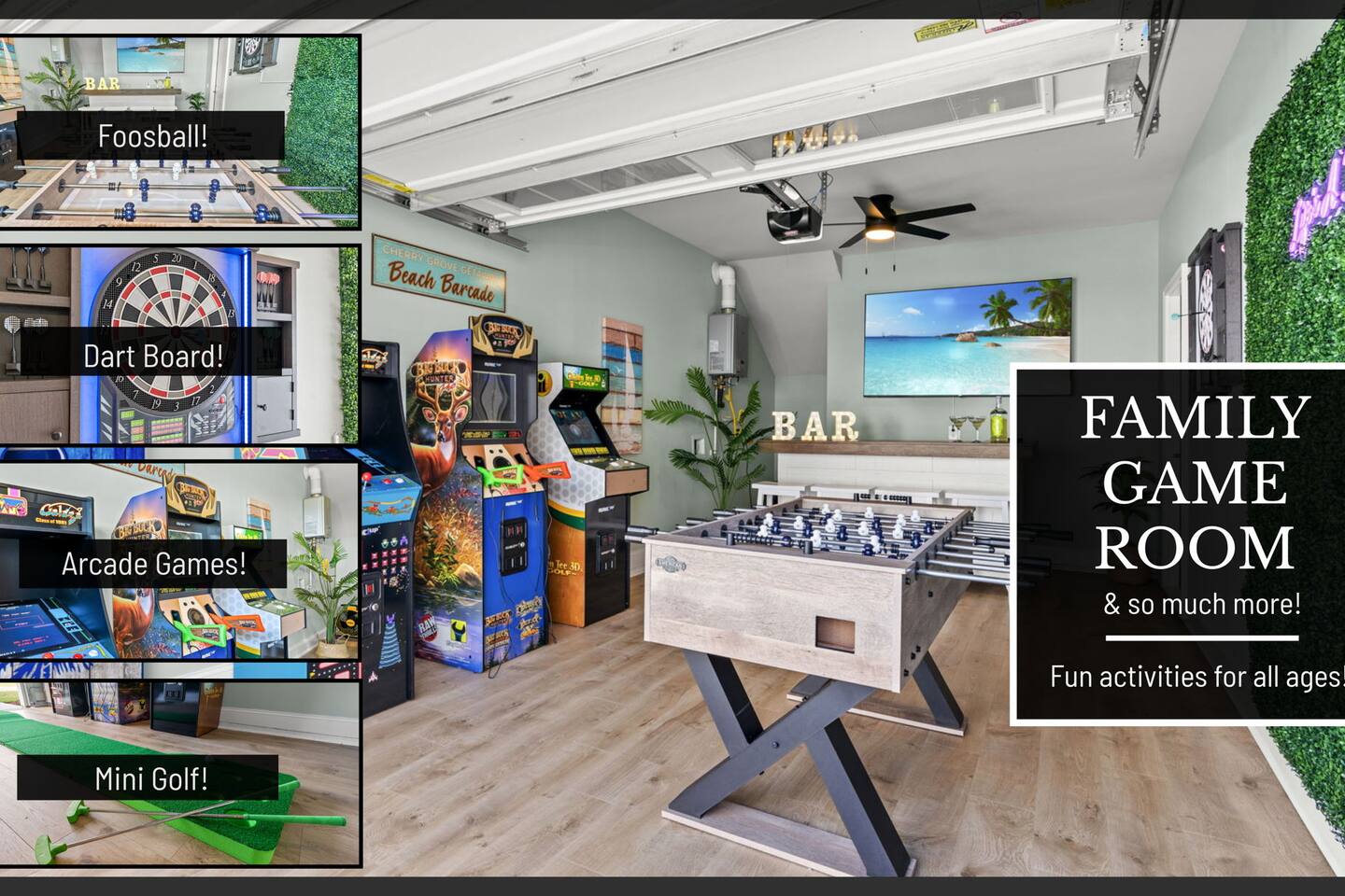 🛋 Modern, Bright & Airy Living Spaces Step into a fresh, open-concept living room with abundant natural light, coastal décor, and plush seating. A large Roku smart TV makes movie nights easy, while high-speed Wi-Fi keeps everyone connected. 🍳 Fully Equipped Kitchen + Dining for 8 Cook with ease in a full kitchen stocked with essentials — stainless steel Whirlpool appliances, drip coffee maker + Keurig, blender, baking sheets, children’s dinnerware, and more. Gather around the spacious dining table with seating for eight, or take meals outside to the patio for fresh air. 🛏 Comfortable Bedrooms for Every Guest • Bedroom 1 (Primary): King bed + en-suite bathroom with double vanity, glass shower, and enclosed toilet. Roku smart TV. • Bedroom 2: King bed, shared hallway bath. Roku smart TV. • Bedroom 3: King bed, shared hallway bath. Roku smart TV. • Bedroom 4: Two full beds, shared hallway bath. Roku smart TV. Every bedroom includes a closet, ceiling fan, and blackout shades. Extra pillows, blankets, and a pack ’n play + high chair are also provided. 🛁 Bathrooms • Primary en-suite: Double vanity + walk-in shower • Full bath (hallway): Tub/shower combo + single vanity • Half bath (downstairs): Convenient for guests and common areas Fresh linens, towels, and starter toiletries are stocked for each stay. 🎮 Private Arcade + Family Fun The garage doubles as an entertainment zone with two full-size arcade machines and a massive 75″ Roku TV. Outside, you’ll find cornhole and battle putt games for friendly competition. 💦 Private Hot Tub Oasis Step onto the covered back patio to your own private hot tub (drained, sanitized, and refilled after every guest). Unwind with the soothing jets, mood lighting, and comfortable seating. 🧺 Laundry + Practical Amenities Enjoy an in-unit washer and dryer with provided laundry pods. The home also offers central heating & dual-zone AC, an electric fireplace, and a fully stocked kitchen for a stress-free stay.