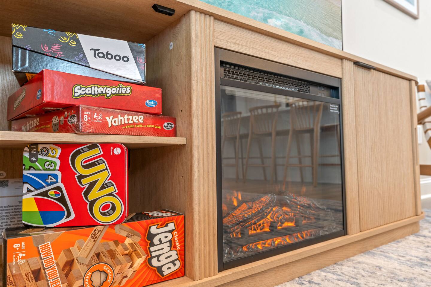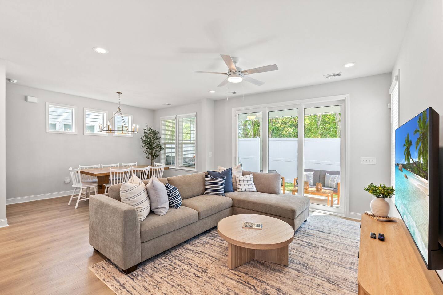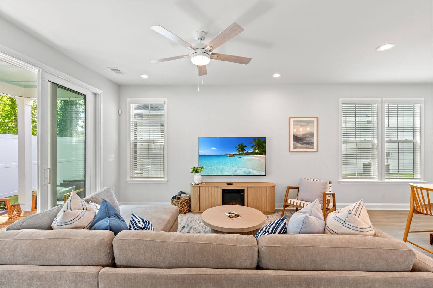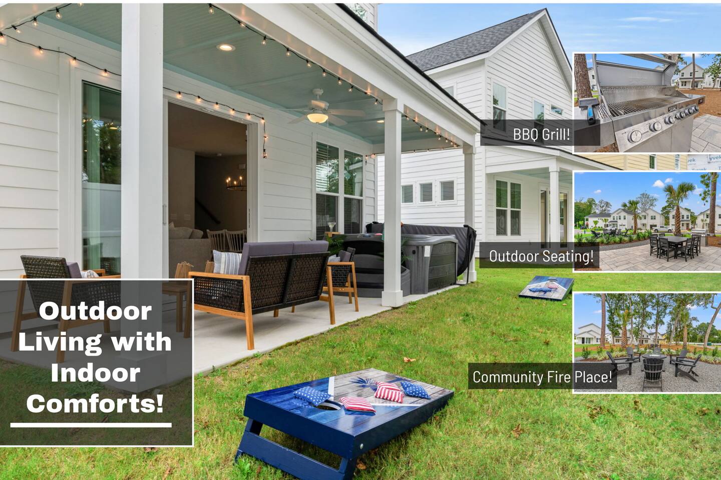 🛋 Modern, Bright & Airy Living Spaces Step into a fresh, open-concept living room with abundant natural light, coastal décor, and plush seating. A large Roku smart TV makes movie nights easy, while high-speed Wi-Fi keeps everyone connected. 🍳 Fully Equipped Kitchen + Dining for 8 Cook with ease in a full kitchen stocked with essentials — stainless steel Whirlpool appliances, drip coffee maker + Keurig, blender, baking sheets, children’s dinnerware, and more. Gather around the spacious dining table with seating for eight, or take meals outside to the patio for fresh air. 🛏 Comfortable Bedrooms for Every Guest • Bedroom 1 (Primary): King bed + en-suite bathroom with double vanity, glass shower, and enclosed toilet. Roku smart TV. • Bedroom 2: King bed, shared hallway bath. Roku smart TV. • Bedroom 3: King bed, shared hallway bath. Roku smart TV. • Bedroom 4: Two full beds, shared hallway bath. Roku smart TV. Every bedroom includes a closet, ceiling fan, and blackout shades. Extra pillows, blankets, and a pack ’n play + high chair are also provided. 🛁 Bathrooms • Primary en-suite: Double vanity + walk-in shower • Full bath (hallway): Tub/shower combo + single vanity • Half bath (downstairs): Convenient for guests and common areas Fresh linens, towels, and starter toiletries are stocked for each stay. 🎮 Private Arcade + Family Fun The garage doubles as an entertainment zone with two full-size arcade machines and a massive 75″ Roku TV. Outside, you’ll find cornhole and battle putt games for friendly competition. 💦 Private Hot Tub Oasis Step onto the covered back patio to your own private hot tub (drained, sanitized, and refilled after every guest). Unwind with the soothing jets, mood lighting, and comfortable seating. 🧺 Laundry + Practical Amenities Enjoy an in-unit washer and dryer with provided laundry pods. The home also offers central heating & dual-zone AC, an electric fireplace, and a fully stocked kitchen for a stress-free stay.