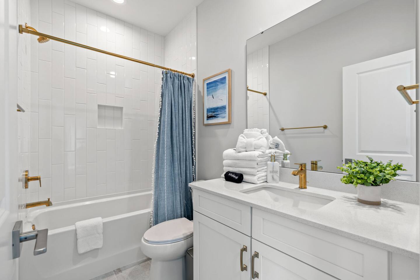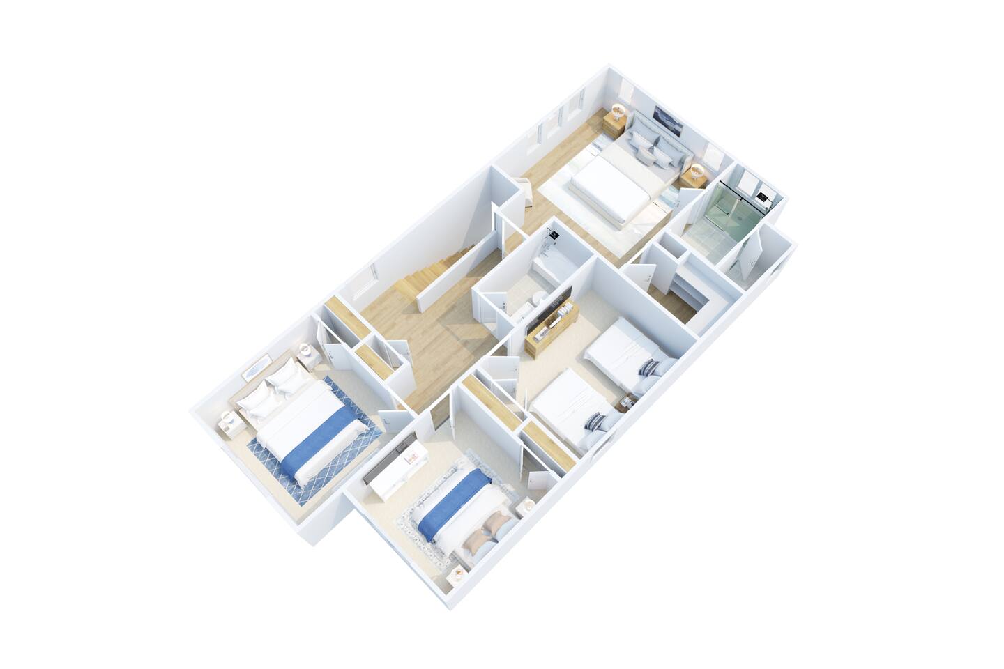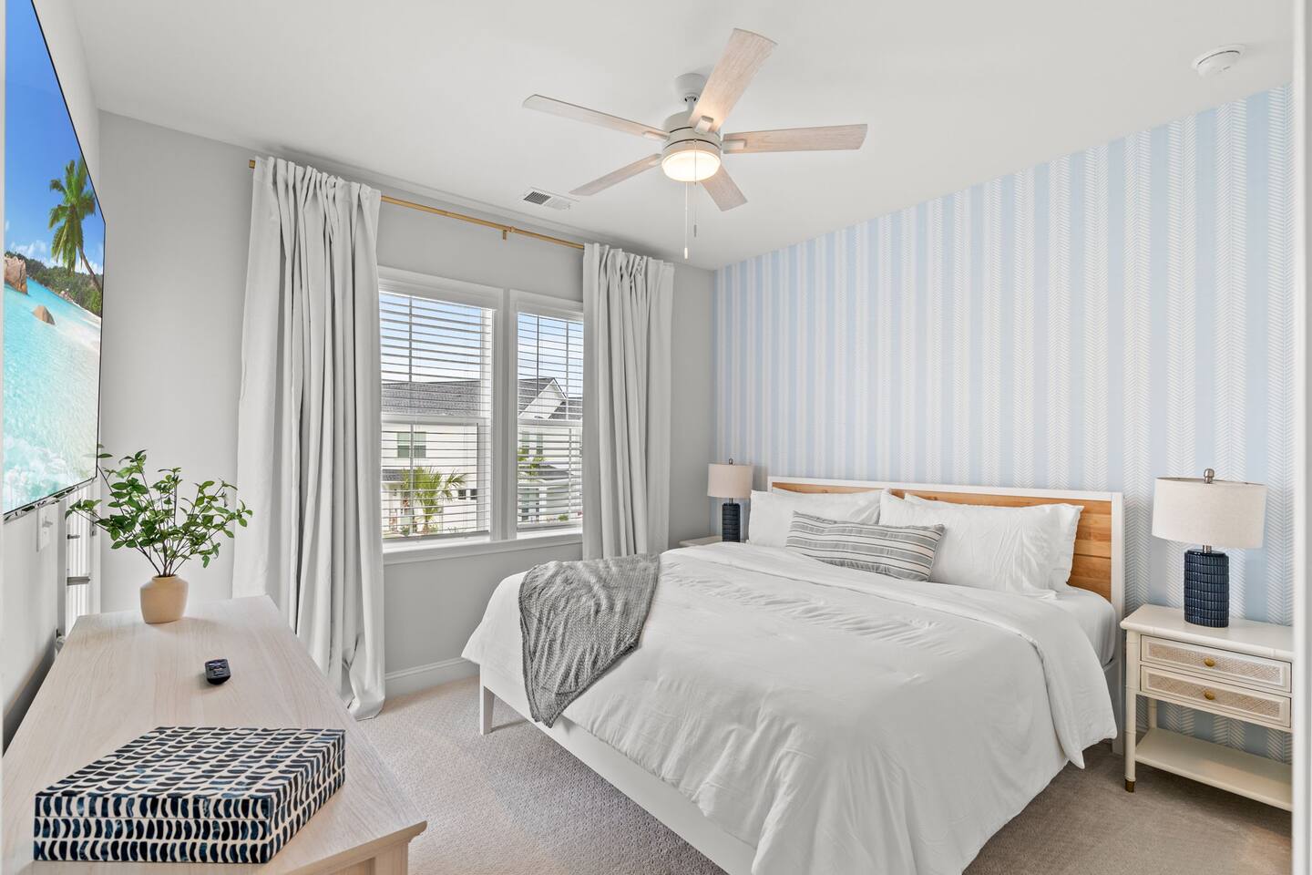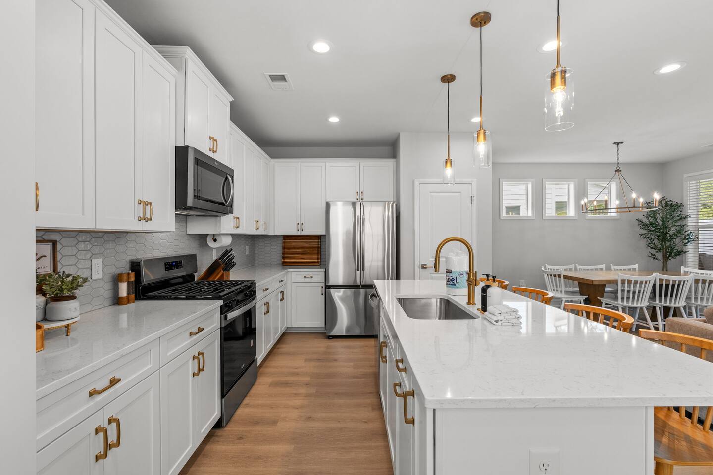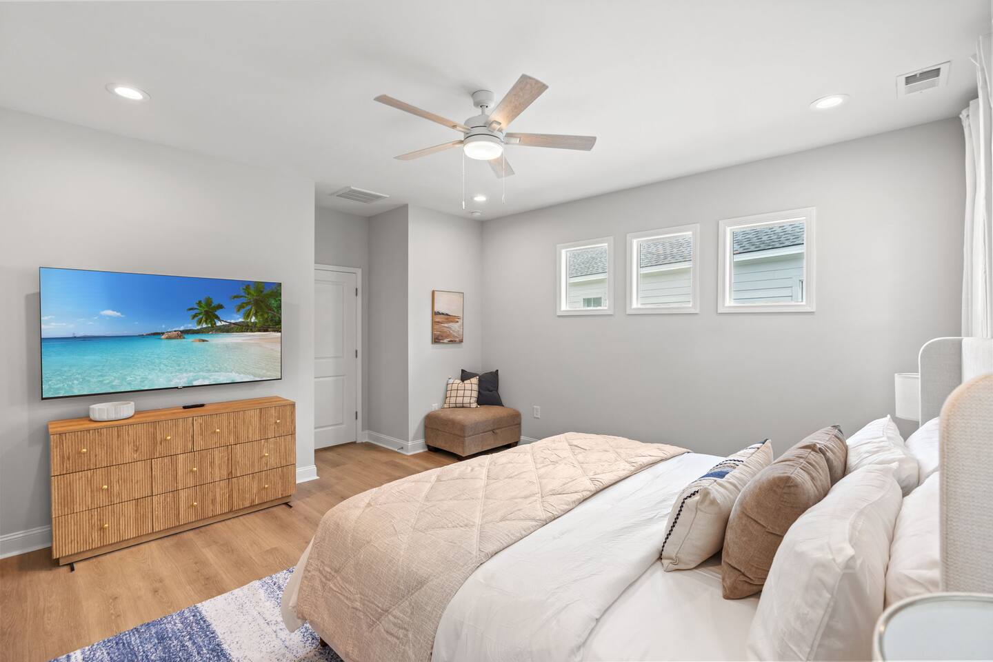 🛋 Modern, Bright & Airy Living Spaces Step into a fresh, open-concept living room with abundant natural light, coastal décor, and plush seating. A large Roku smart TV makes movie nights easy, while high-speed Wi-Fi keeps everyone connected. 🍳 Fully Equipped Kitchen + Dining for 8 Cook with ease in a full kitchen stocked with essentials — stainless steel Whirlpool appliances, drip coffee maker + Keurig, blender, baking sheets, children’s dinnerware, and more. Gather around the spacious dining table with seating for eight, or take meals outside to the patio for fresh air. 🛏 Comfortable Bedrooms for Every Guest • Bedroom 1 (Primary): King bed + en-suite bathroom with double vanity, glass shower, and enclosed toilet. Roku smart TV. • Bedroom 2: King bed, shared hallway bath. Roku smart TV. • Bedroom 3: King bed, shared hallway bath. Roku smart TV. • Bedroom 4: Two full beds, shared hallway bath. Roku smart TV. Every bedroom includes a closet, ceiling fan, and blackout shades. Extra pillows, blankets, and a pack ’n play + high chair are also provided. 🛁 Bathrooms • Primary en-suite: Double vanity + walk-in shower • Full bath (hallway): Tub/shower combo + single vanity • Half bath (downstairs): Convenient for guests and common areas Fresh linens, towels, and starter toiletries are stocked for each stay. 🎮 Private Arcade + Family Fun The garage doubles as an entertainment zone with two full-size arcade machines and a massive 75″ Roku TV. Outside, you’ll find cornhole and battle putt games for friendly competition. 💦 Private Hot Tub Oasis Step onto the covered back patio to your own private hot tub (drained, sanitized, and refilled after every guest). Unwind with the soothing jets, mood lighting, and comfortable seating. 🧺 Laundry + Practical Amenities Enjoy an in-unit washer and dryer with provided laundry pods. The home also offers central heating & dual-zone AC, an electric fireplace, and a fully stocked kitchen for a stress-free stay.