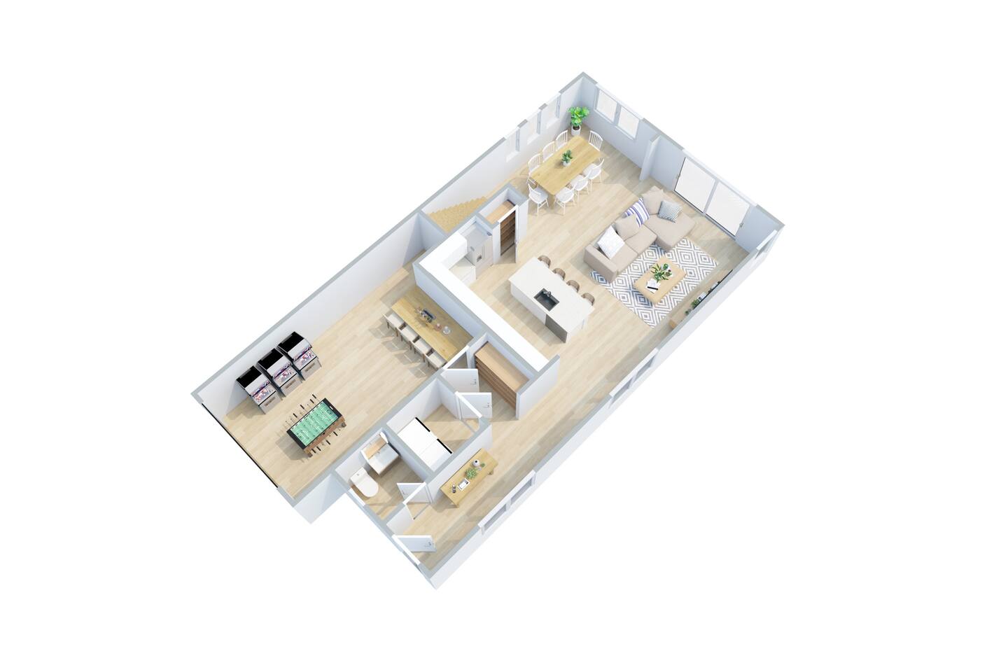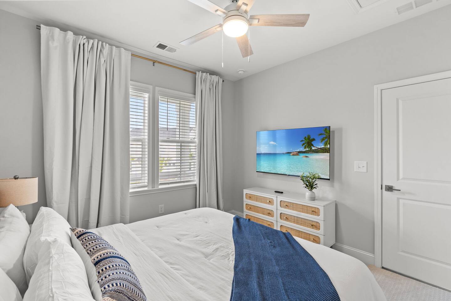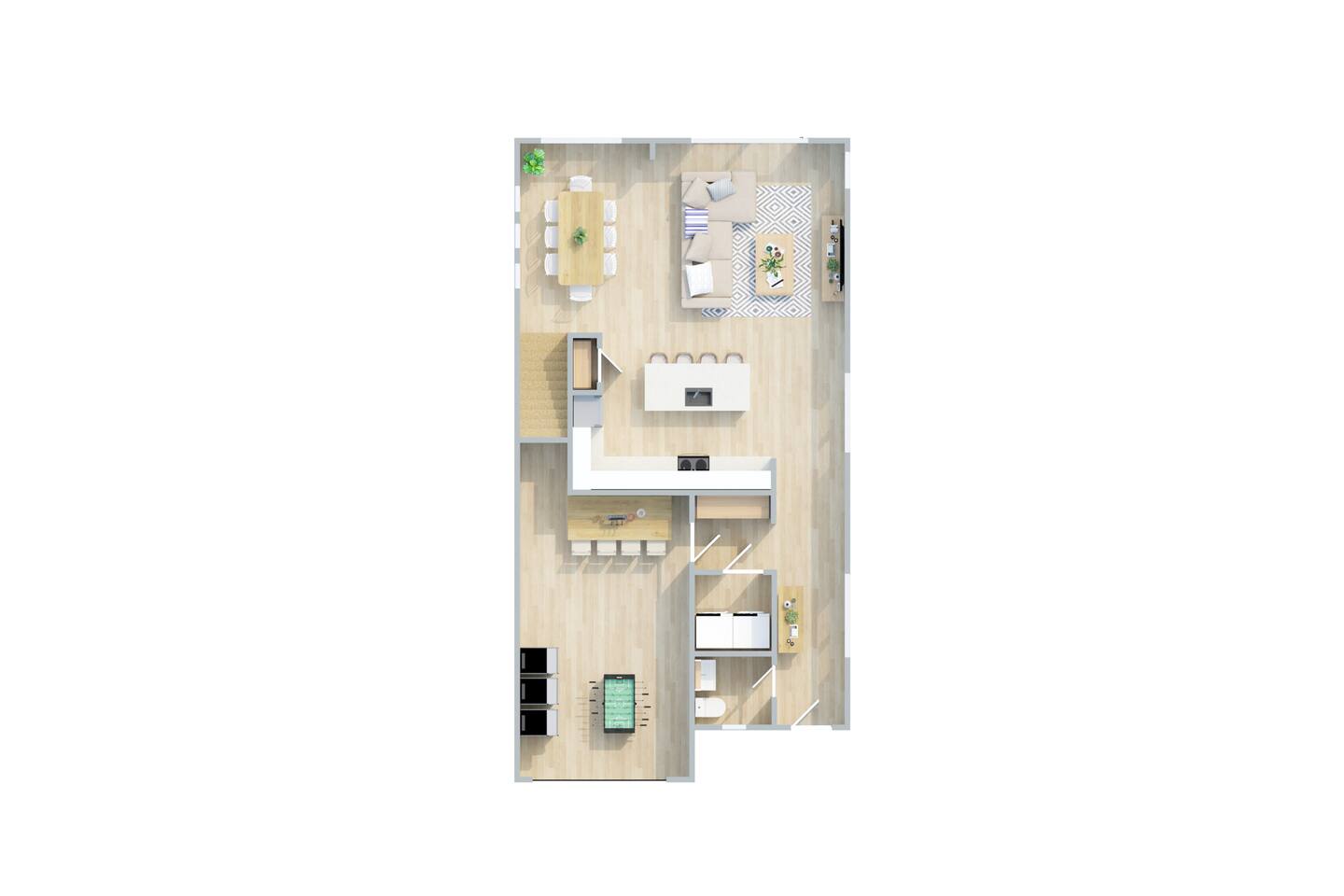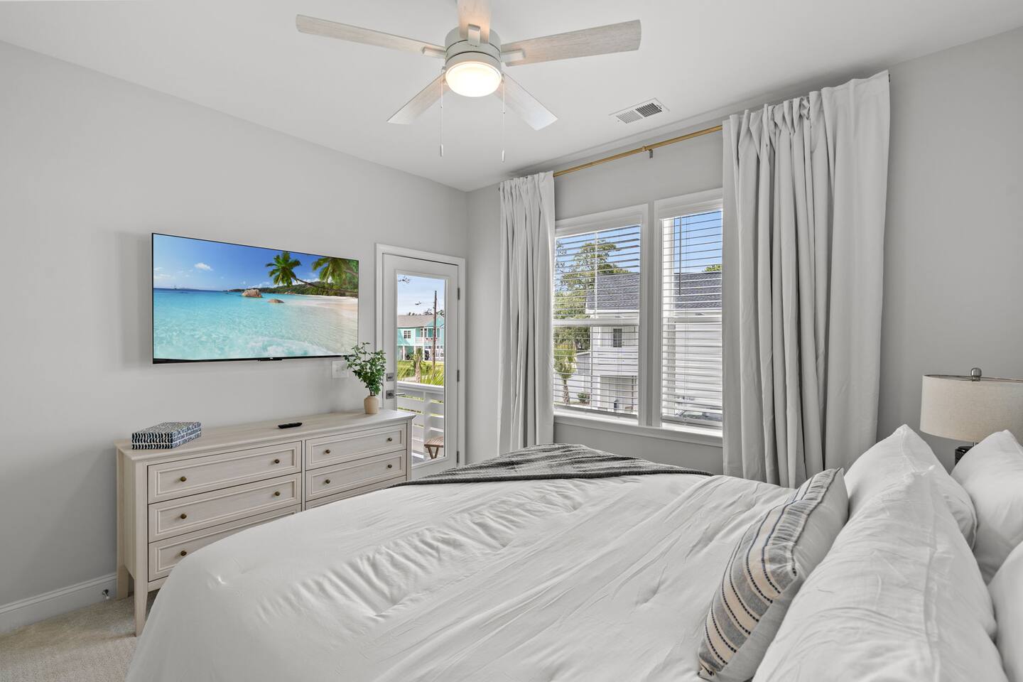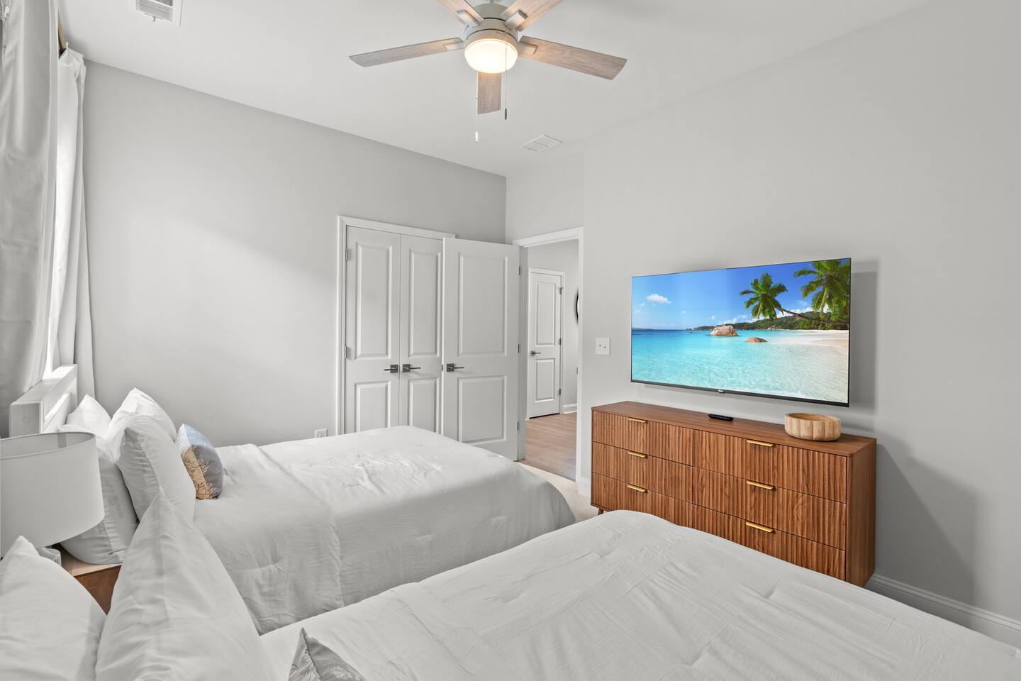 🛋 Modern, Bright & Airy Living Spaces Step into a fresh, open-concept living room with abundant natural light, coastal décor, and plush seating. A large Roku smart TV makes movie nights easy, while high-speed Wi-Fi keeps everyone connected. 🍳 Fully Equipped Kitchen + Dining for 8 Cook with ease in a full kitchen stocked with essentials — stainless steel Whirlpool appliances, drip coffee maker + Keurig, blender, baking sheets, children’s dinnerware, and more. Gather around the spacious dining table with seating for eight, or take meals outside to the patio for fresh air. 🛏 Comfortable Bedrooms for Every Guest • Bedroom 1 (Primary): King bed + en-suite bathroom with double vanity, glass shower, and enclosed toilet. Roku smart TV. • Bedroom 2: King bed, shared hallway bath. Roku smart TV. • Bedroom 3: King bed, shared hallway bath. Roku smart TV. • Bedroom 4: Two full beds, shared hallway bath. Roku smart TV. Every bedroom includes a closet, ceiling fan, and blackout shades. Extra pillows, blankets, and a pack ’n play + high chair are also provided. 🛁 Bathrooms • Primary en-suite: Double vanity + walk-in shower • Full bath (hallway): Tub/shower combo + single vanity • Half bath (downstairs): Convenient for guests and common areas Fresh linens, towels, and starter toiletries are stocked for each stay. 🎮 Private Arcade + Family Fun The garage doubles as an entertainment zone with two full-size arcade machines and a massive 75″ Roku TV. Outside, you’ll find cornhole and battle putt games for friendly competition. 💦 Private Hot Tub Oasis Step onto the covered back patio to your own private hot tub (drained, sanitized, and refilled after every guest). Unwind with the soothing jets, mood lighting, and comfortable seating. 🧺 Laundry + Practical Amenities Enjoy an in-unit washer and dryer with provided laundry pods. The home also offers central heating & dual-zone AC, an electric fireplace, and a fully stocked kitchen for a stress-free stay.