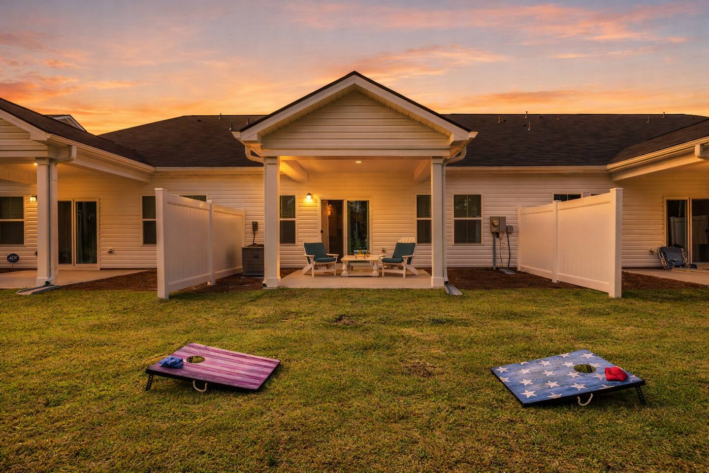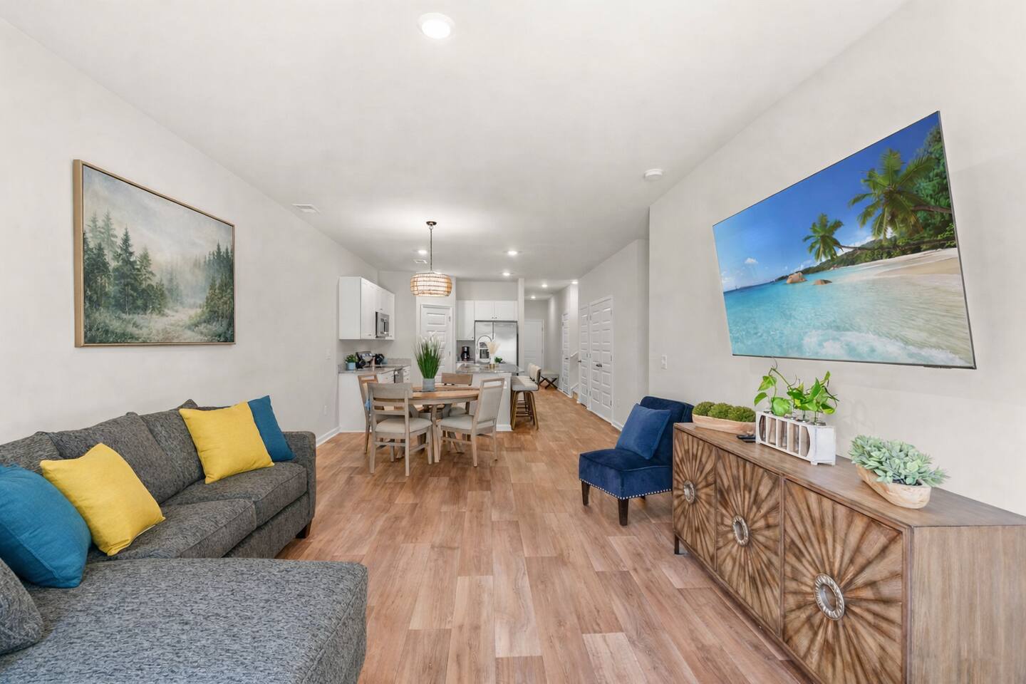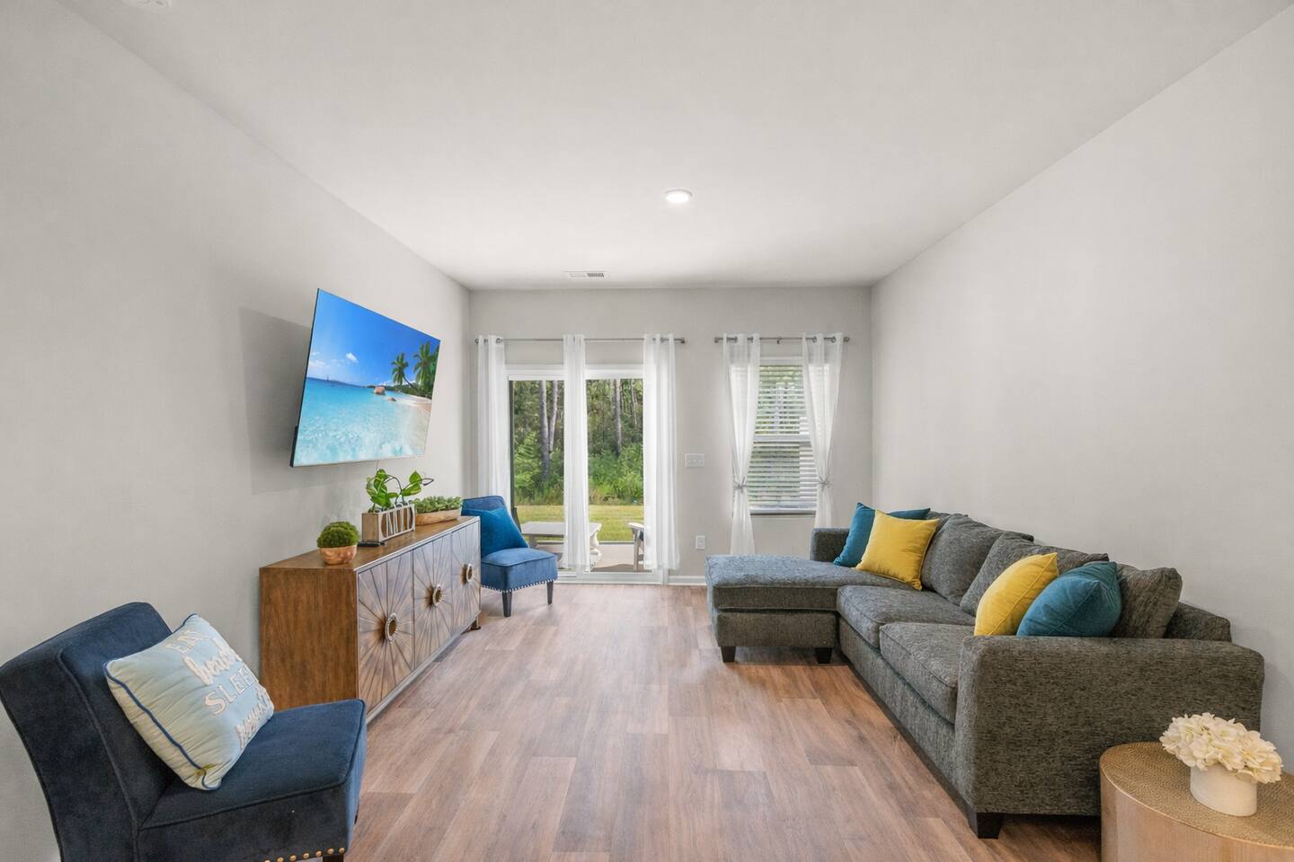 🏡 Spacious Coastal Townhouse Near Golf, Pool & Beaches Townhouse | Sleeps 8 | 4 Bedrooms | 3 Full Baths Welcome to your coastal home base in the desirable Cameron Woods community, a quiet, resort-style neighborhood near Ocean Isle and Sunset Beach. This newly built, two-story townhouse offers modern comfort, generous space, and access to top community amenities—perfect for families, couples traveling together, or extended stays. 🛏️ Sleeping Arrangements (Comfortably Sleeps 8) ✦︎ Primary Bedroom: King bed, private en-suite bathroom, walk-in closet ✦︎ Bedroom 2: King bed ✦︎ Bedroom 3: King bed ✦︎ Bedroom 4: Queen bed, private en-suite bathroom 🚿 Bathrooms ✦︎ 3 full bathrooms total ✦︎ Primary en-suite: Walk-in shower, double vanity ✦︎ Two additional bathrooms: Tub/shower combos (great for families) ✦︎ Hair dryer provided in the primary bathroom ✨ What Guests Love About This Home ✦︎ Newly built (modern finishes & layout) ✦︎ Open-concept living, dining, and kitchen ✦︎ Two living/lounge areas (great for groups) ✦︎ Private covered patio with seating ✦︎ Quiet, well-maintained community ✦︎ Excellent for 30+ day stays 📍 Location Highlights (Approximate Drive Times) ✦︎ 🌊 Ocean Isle Beach: ~5–10 minutes by car ✦︎ 🌅 Sunset Beach: ~10–15 minutes by car ✦︎ ⛳ Close to area golf courses, coastal dining, and shopping ✦︎ Easy access to main roads for day trips along the Brunswick County coast 🍳 Kitchen & Living ✦︎ Fully equipped kitchen with stainless steel appliances ✦︎ Large island with seating ✦︎ Dining area for shared meals ✦︎ Smart TVs: ✦︎ 65” Smart TV in main living room ✦︎ 75” Smart TV in upstairs loft ✦︎ Streaming services available (no cable) 🧺 Amenities & Conveniences ✔ Free high-speed Wi-Fi ✔ Full-size washer & dryer (free, in-unit) ✔ Central air conditioning (brand new) ✔ Smart thermostat ✔ Private driveway & garage parking ✔ Private backyard with covered patio ✔ Keyless entry