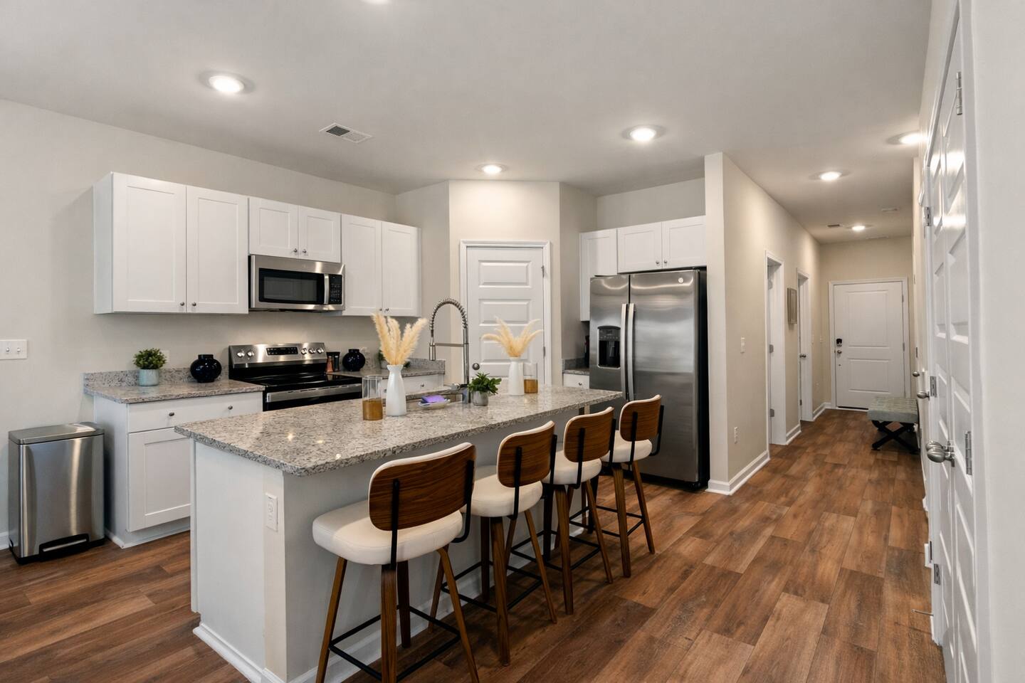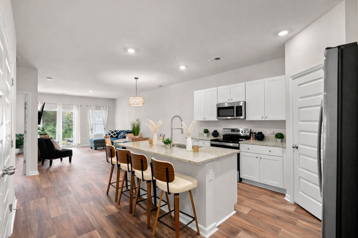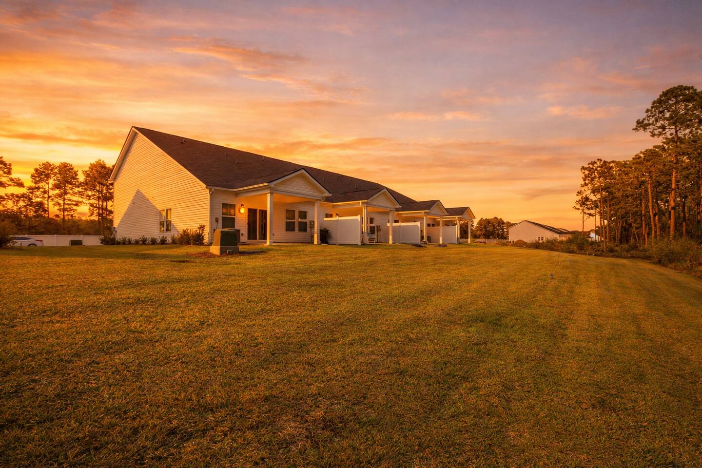 🏡 Spacious Coastal Townhouse Near Golf, Pool & Beaches Townhouse | Sleeps 8 | 4 Bedrooms | 3 Full Baths Welcome to your coastal home base in the desirable Cameron Woods community, a quiet, resort-style neighborhood near Ocean Isle and Sunset Beach. This newly built, two-story townhouse offers modern comfort, generous space, and access to top community amenities—perfect for families, couples traveling together, or extended stays. 🛏️ Sleeping Arrangements (Comfortably Sleeps 8) ✦︎ Primary Bedroom: King bed, private en-suite bathroom, walk-in closet ✦︎ Bedroom 2: King bed ✦︎ Bedroom 3: King bed ✦︎ Bedroom 4: Queen bed, private en-suite bathroom 🚿 Bathrooms ✦︎ 3 full bathrooms total ✦︎ Primary en-suite: Walk-in shower, double vanity ✦︎ Two additional bathrooms: Tub/shower combos (great for families) ✦︎ Hair dryer provided in the primary bathroom ✨ What Guests Love About This Home ✦︎ Newly built (modern finishes & layout) ✦︎ Open-concept living, dining, and kitchen ✦︎ Two living/lounge areas (great for groups) ✦︎ Private covered patio with seating ✦︎ Quiet, well-maintained community ✦︎ Excellent for 30+ day stays 📍 Location Highlights (Approximate Drive Times) ✦︎ 🌊 Ocean Isle Beach: ~5–10 minutes by car ✦︎ 🌅 Sunset Beach: ~10–15 minutes by car ✦︎ ⛳ Close to area golf courses, coastal dining, and shopping ✦︎ Easy access to main roads for day trips along the Brunswick County coast 🍳 Kitchen & Living ✦︎ Fully equipped kitchen with stainless steel appliances ✦︎ Large island with seating ✦︎ Dining area for shared meals ✦︎ Smart TVs: ✦︎ 65” Smart TV in main living room ✦︎ 75” Smart TV in upstairs loft ✦︎ Streaming services available (no cable) 🧺 Amenities & Conveniences ✔ Free high-speed Wi-Fi ✔ Full-size washer & dryer (free, in-unit) ✔ Central air conditioning (brand new) ✔ Smart thermostat ✔ Private driveway & garage parking ✔ Private backyard with covered patio ✔ Keyless entry