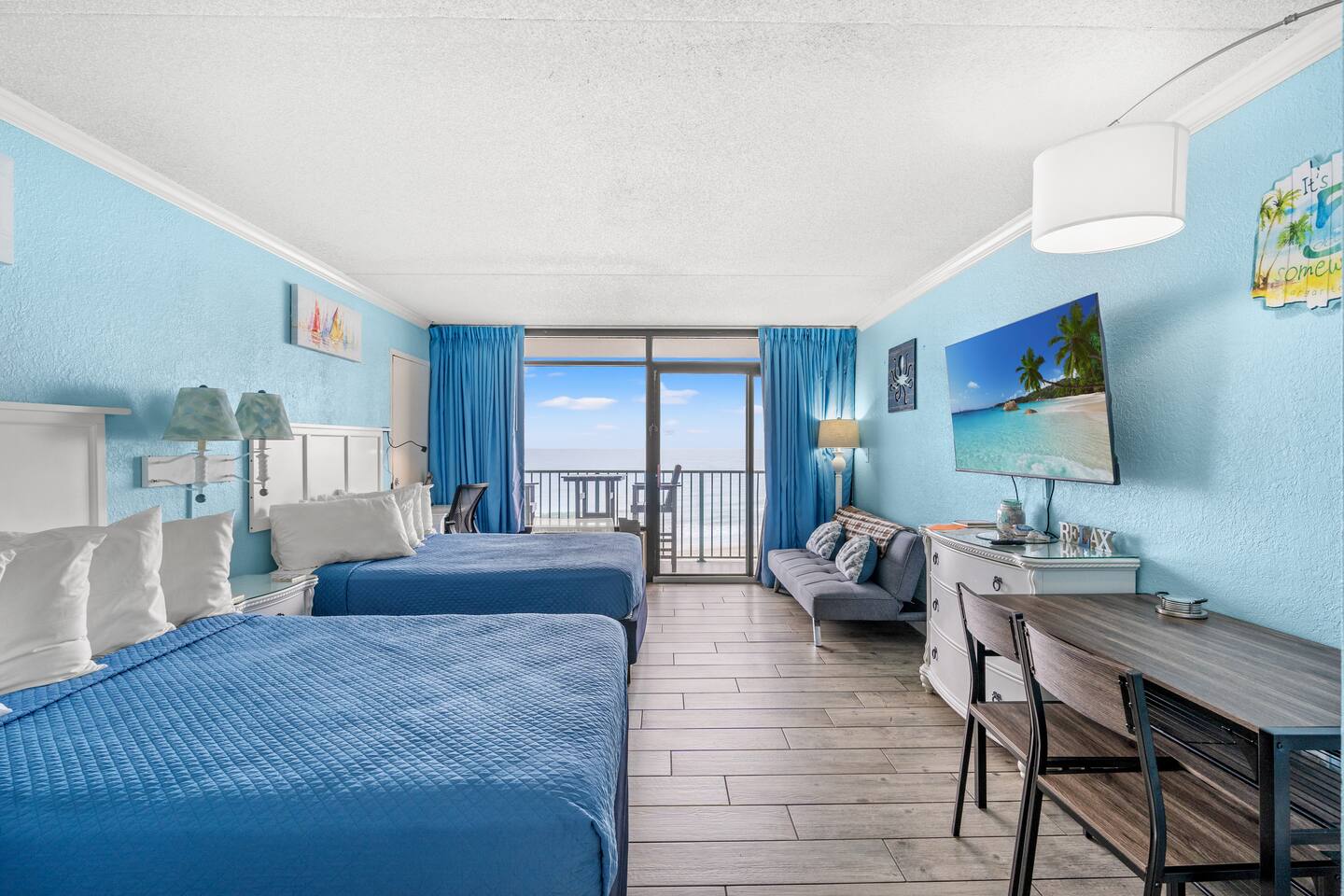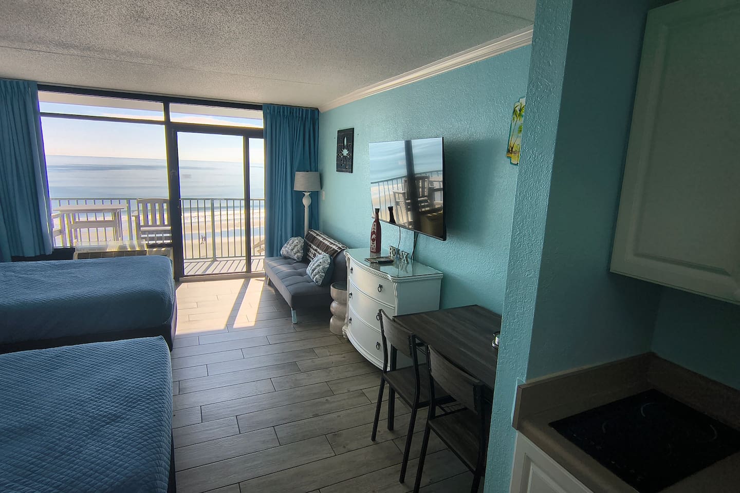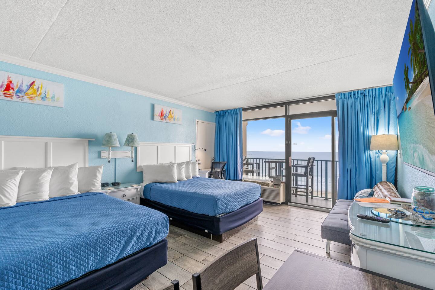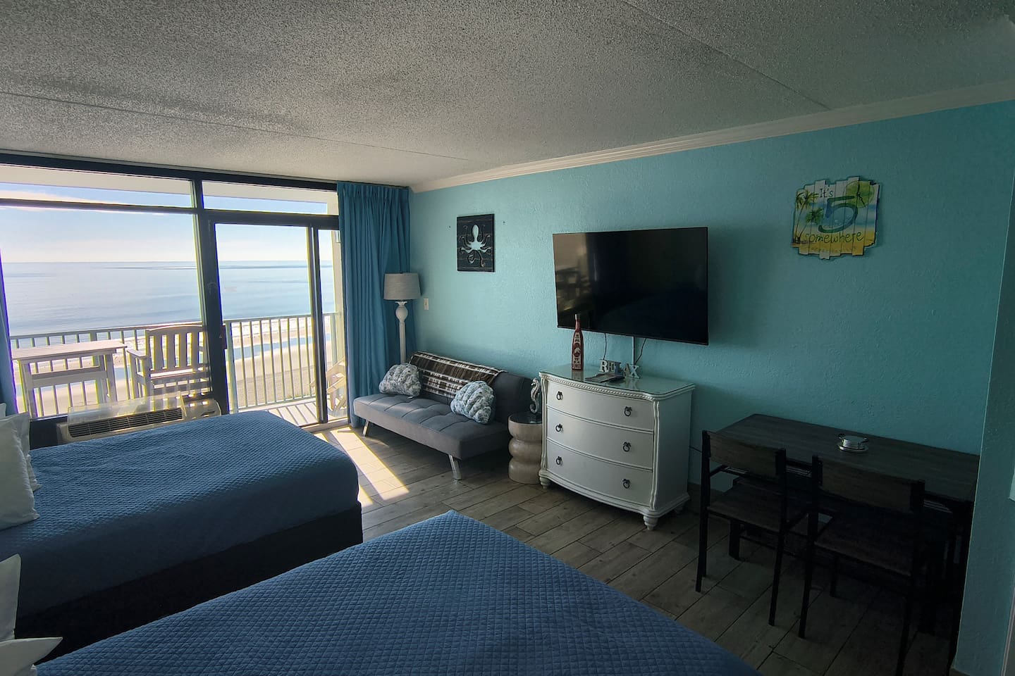 Wake up to ocean views at Sand Dunes Resort! This cozy studio features a private balcony, two full beds, resort pools, lazy river, beach access, and free parking—perfect for couples or small families seeking a relaxing Myrtle Beach getaway.