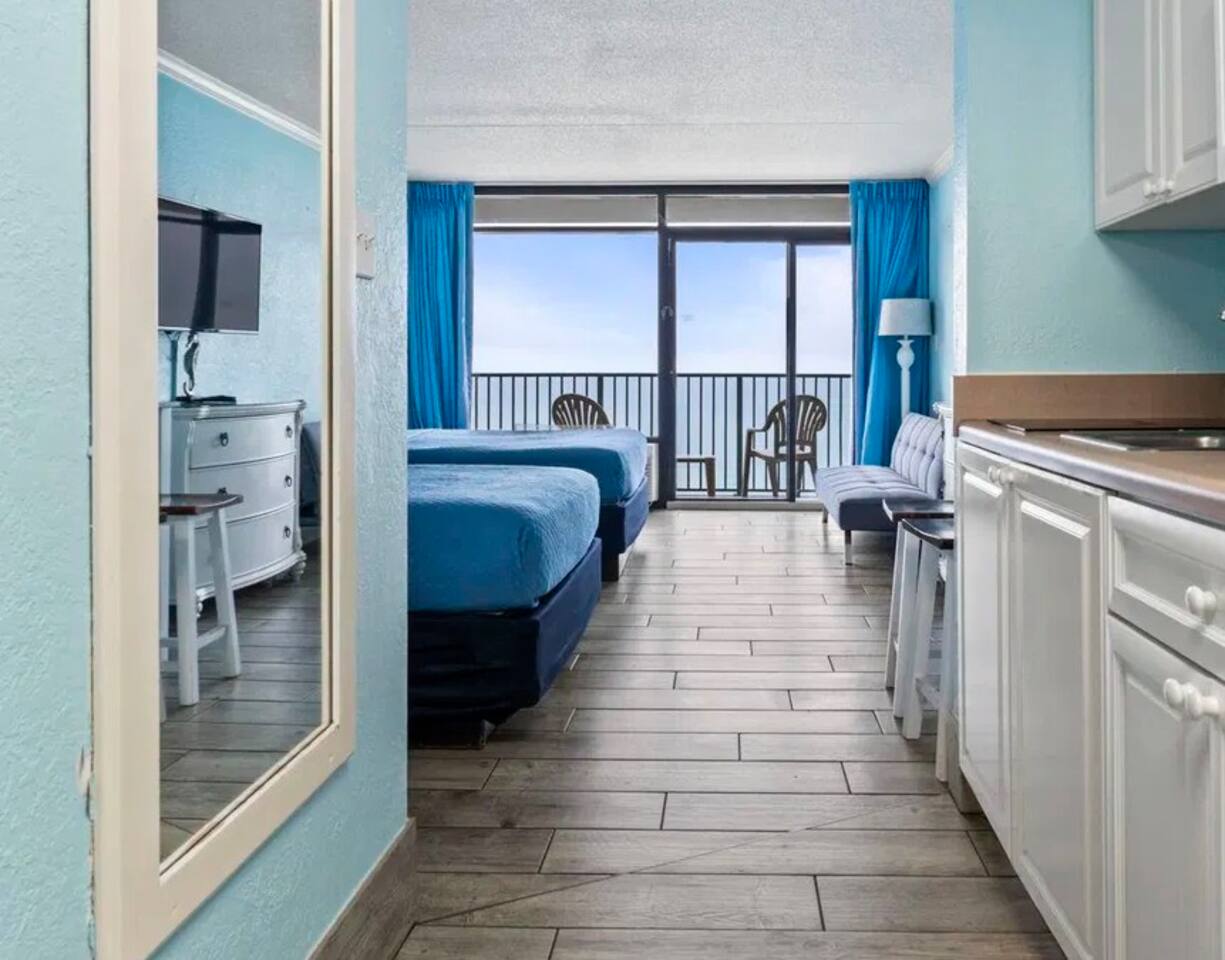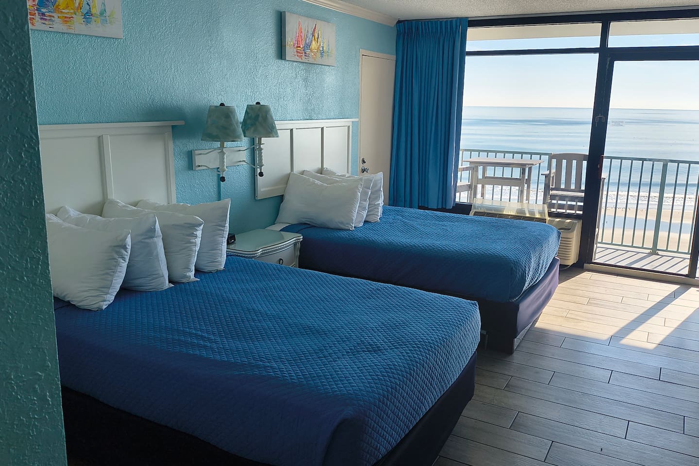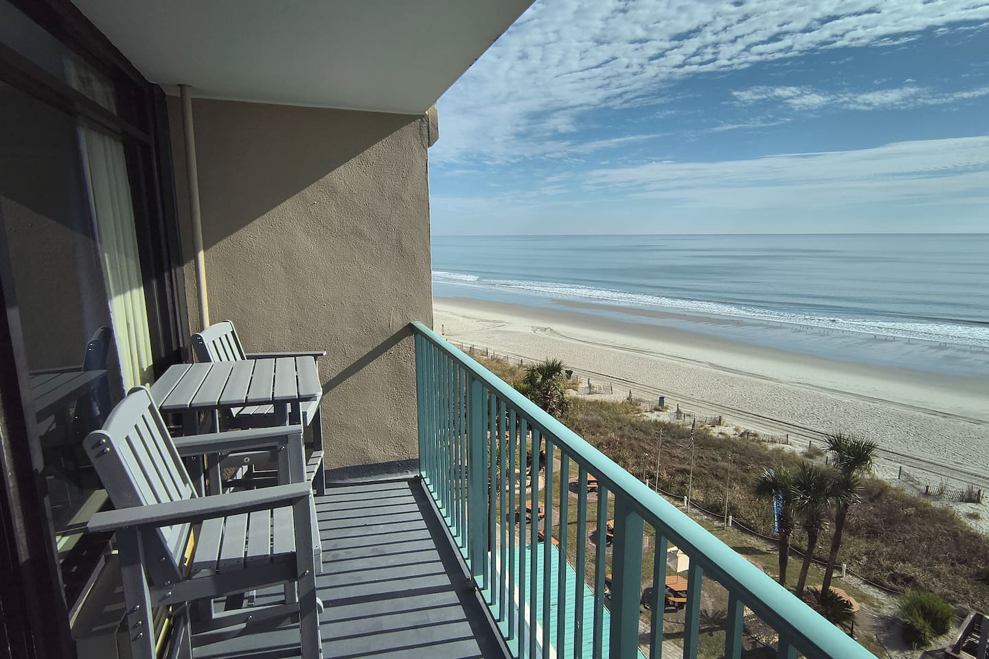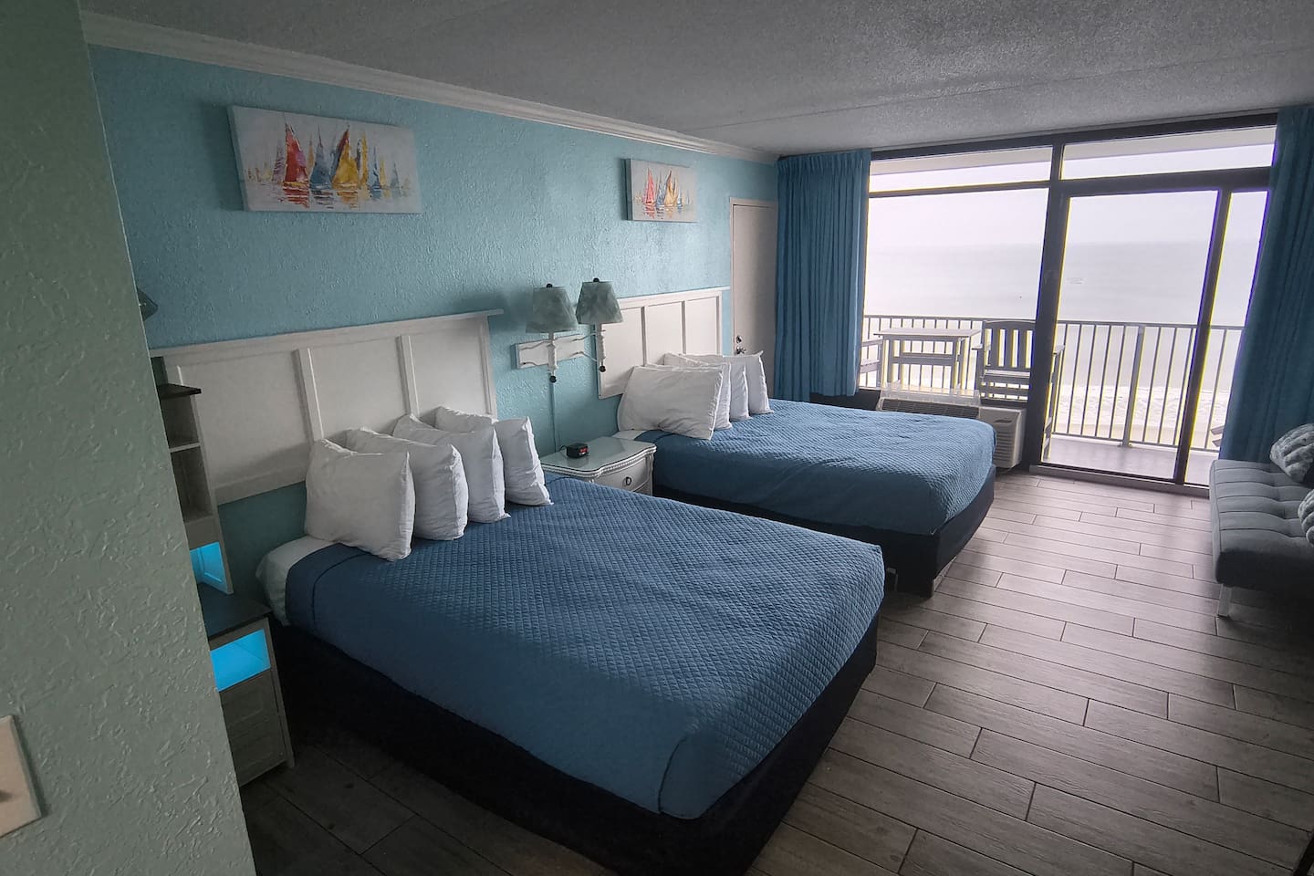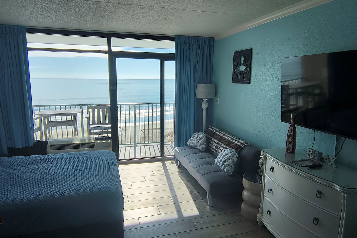Wake up to ocean views at Sand Dunes Resort! This cozy studio features a private balcony, two full beds, resort pools, lazy river, beach access, and free parking—perfect for couples or small families seeking a relaxing Myrtle Beach getaway.
