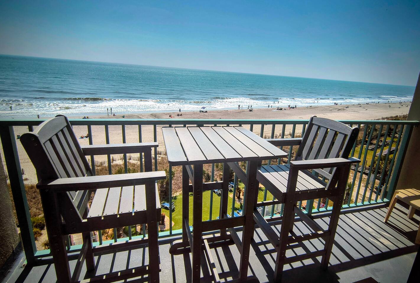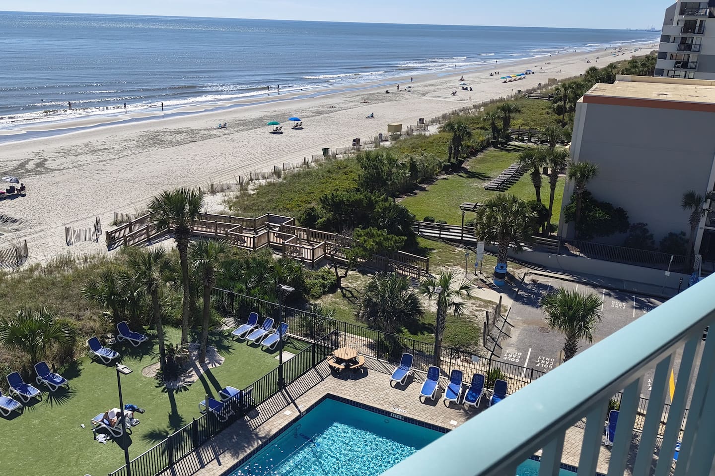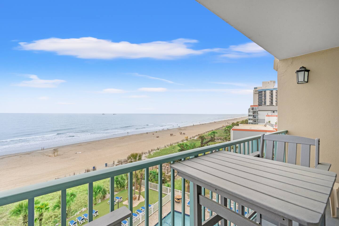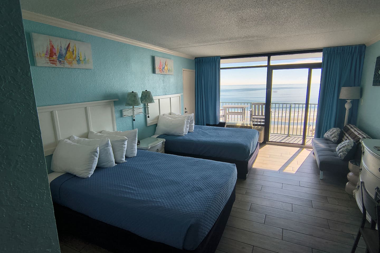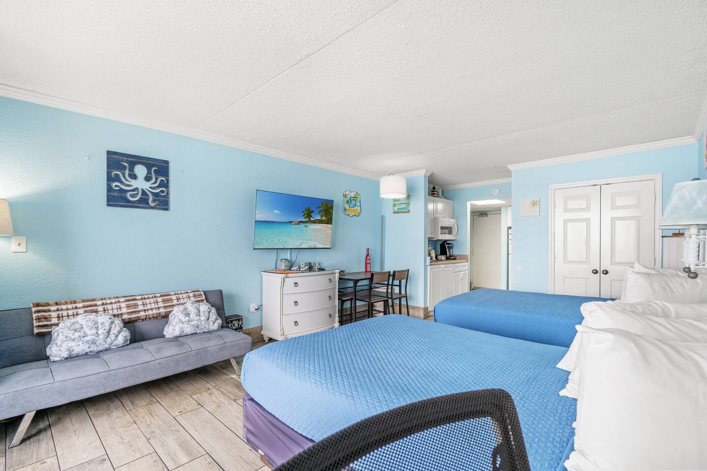 Wake up to ocean views at Sand Dunes Resort! This cozy studio features a private balcony, two full beds, resort pools, lazy river, beach access, and free parking—perfect for couples or small families seeking a relaxing Myrtle Beach getaway.