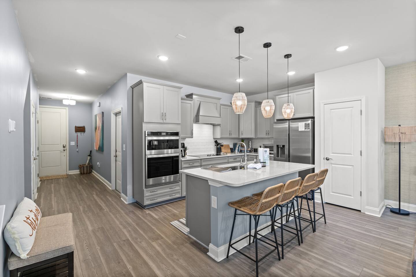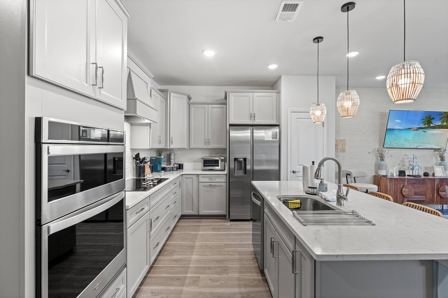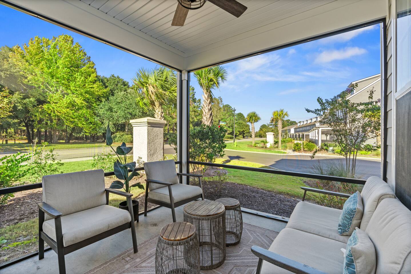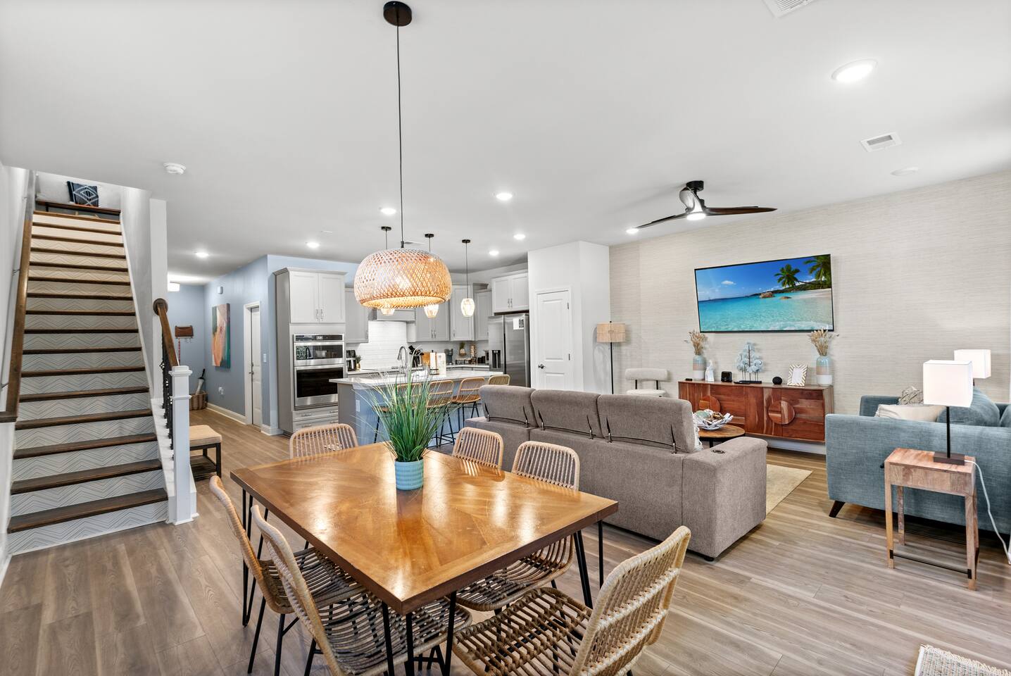 🛌 Sleeping Arrangements • Bedroom 1 (Primary Suite) – King bed, ensuite bathroom (shower, double vanity) • Bedroom 2 – 1 Queen Bed • Bedroom 3 – 1 Queen Bed • Bedroom 4 – 2 Full Bed • Additional Rooms – Spacious closets, fresh linens, and blackout curtains 🛁 Bathrooms • 1 Half bath (first floor) • 1 Full bath (second floor) – tub/shower combo • 1 Ensuite full bath – shower, double vanity • 1 Full bath (third floor) – shower and single vanity 🍽 Kitchen & Dining Fully stocked kitchen with everything you need to cook family meals: • Full-size refrigerator, stove, oven, microwave, and dishwasher • Coffee maker, blender, toaster, pots/pans, and utensils • Dining table for 6 + breakfast bar seating 🌴 Outdoor Area Enjoy your morning coffee or evening drinks on the screened-in porch or outdoor patio. Relax in a peaceful, private space just a few minutes from the beach breeze.
