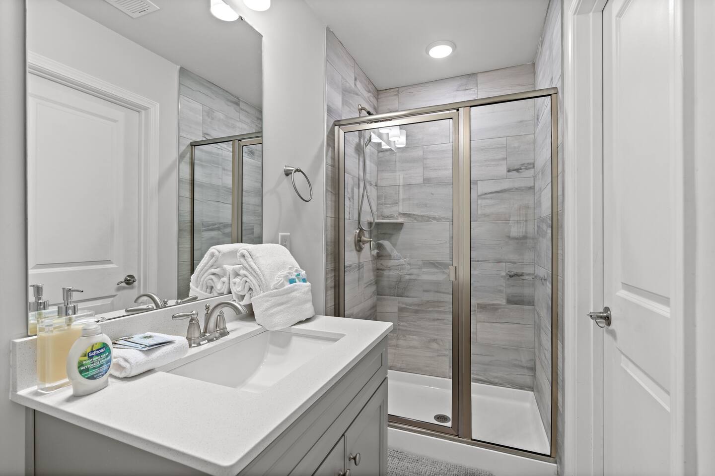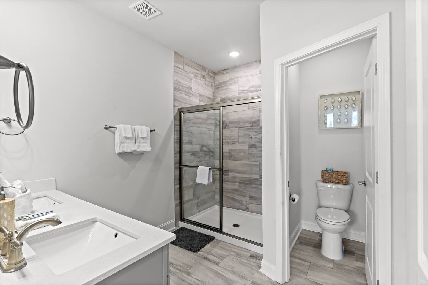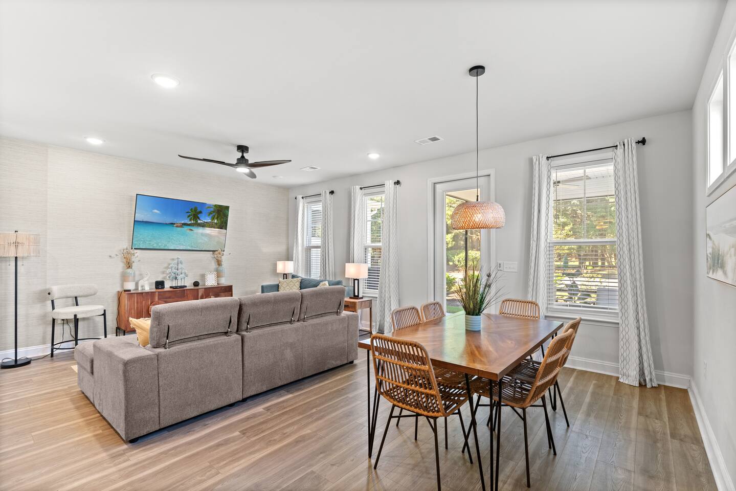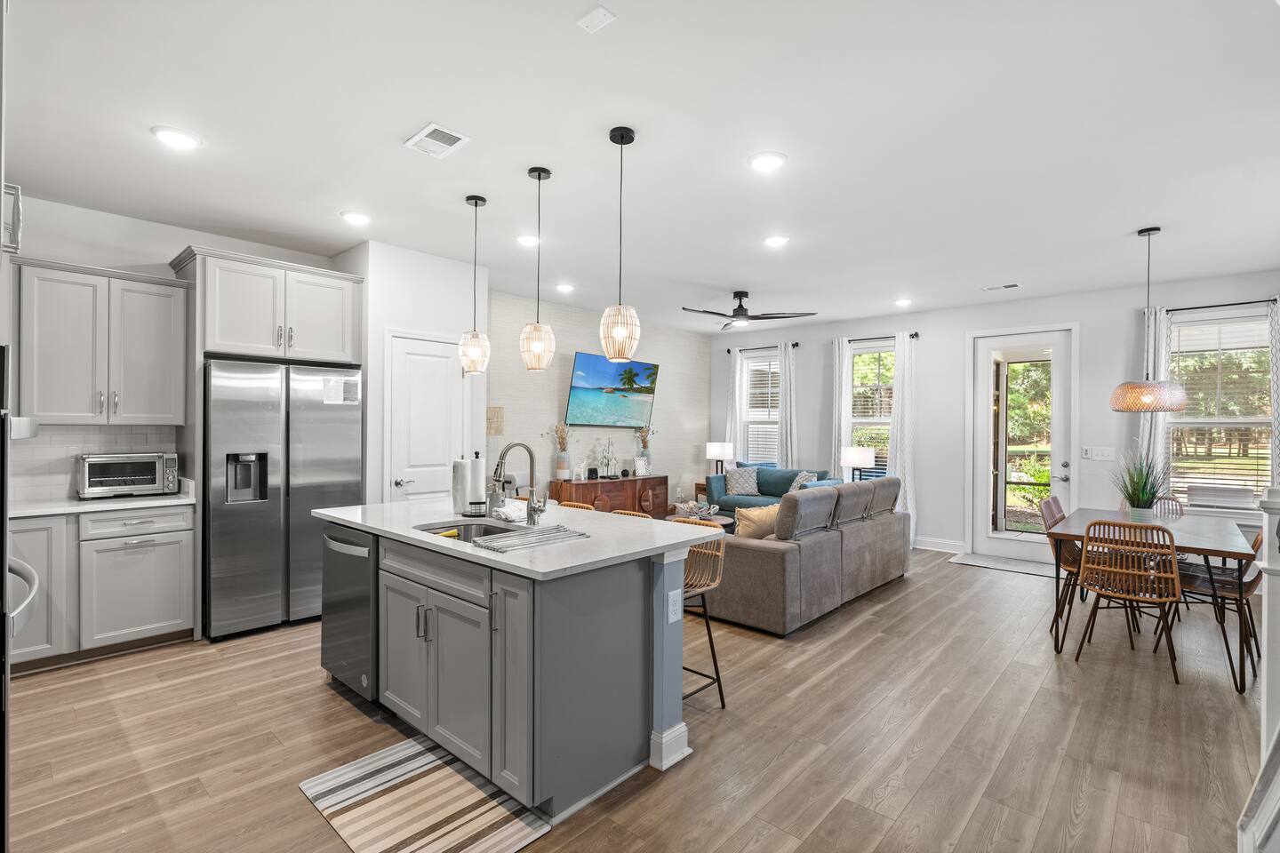 🛌 Sleeping Arrangements • Bedroom 1 (Primary Suite) – King bed, ensuite bathroom (shower, double vanity) • Bedroom 2 – 1 Queen Bed • Bedroom 3 – 1 Queen Bed • Bedroom 4 – 2 Full Bed • Additional Rooms – Spacious closets, fresh linens, and blackout curtains 🛁 Bathrooms • 1 Half bath (first floor) • 1 Full bath (second floor) – tub/shower combo • 1 Ensuite full bath – shower, double vanity • 1 Full bath (third floor) – shower and single vanity 🍽 Kitchen & Dining Fully stocked kitchen with everything you need to cook family meals: • Full-size refrigerator, stove, oven, microwave, and dishwasher • Coffee maker, blender, toaster, pots/pans, and utensils • Dining table for 6 + breakfast bar seating 🌴 Outdoor Area Enjoy your morning coffee or evening drinks on the screened-in porch or outdoor patio. Relax in a peaceful, private space just a few minutes from the beach breeze.